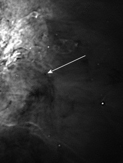 Protoplanetárny disk v hmlovine M42, tzv. Edge-On. SW 254/1000 + Halfa ilter + ZWO ASI120MM. 150x10 s. 29.12.2017. Autor: Peter Dolinský.