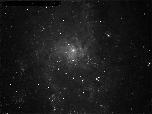 Galaxia M33 v súhvezdí trojuholník. Fotografia vznikla pri skúške prístrojov na nižšie spomínaný zákryt. Newton SW 250/1000mm, AZ-EQ6, kamera ASI120MM. Autor: Peter Dolinský.