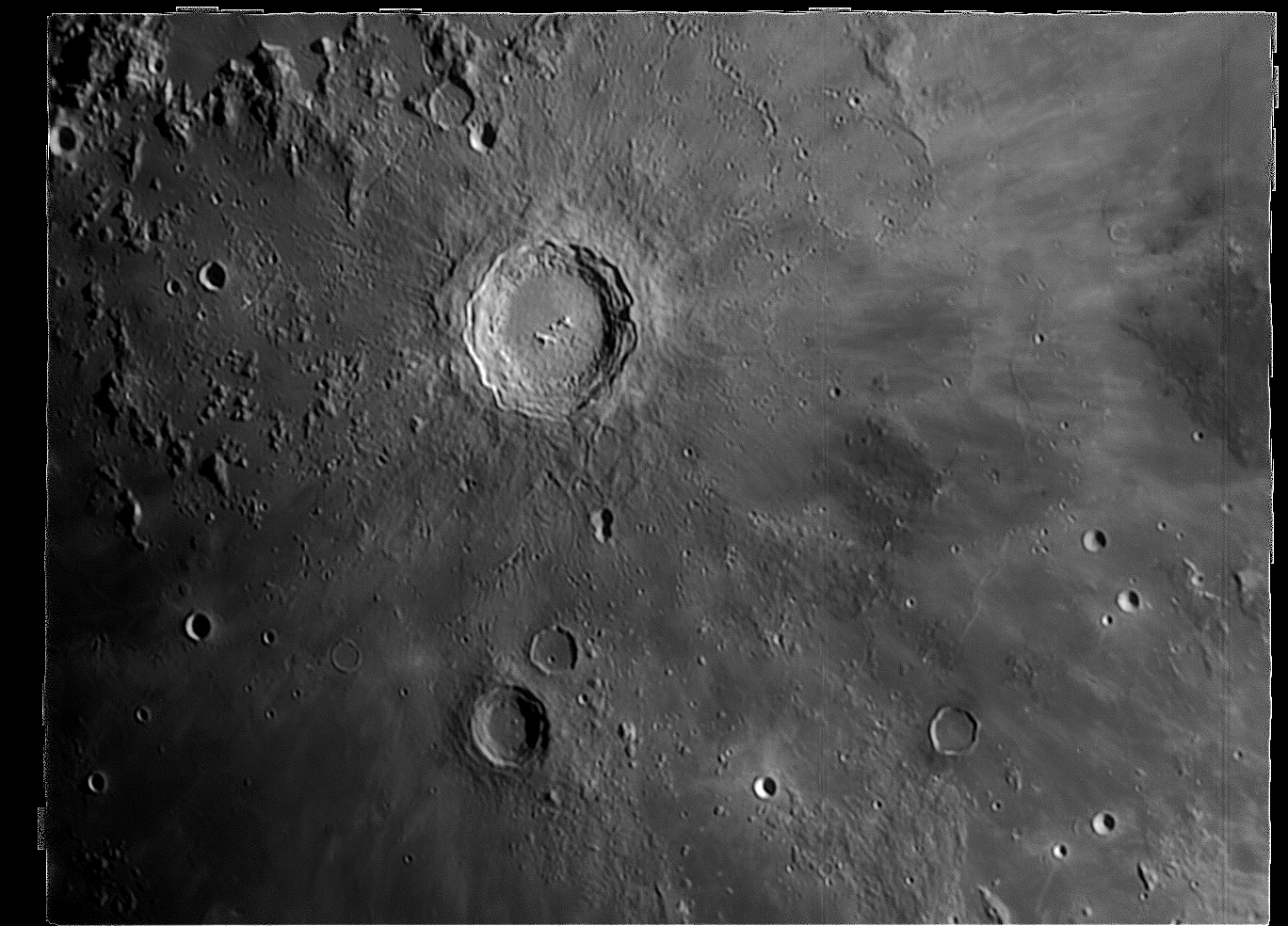 Kráter Kopernik (priemer 93 km). Dalekohľad Kutter 110/2720 + ZWO ASI120MM. 25.2.2018, 20:37 UT. Autor: Peter Dolinský.