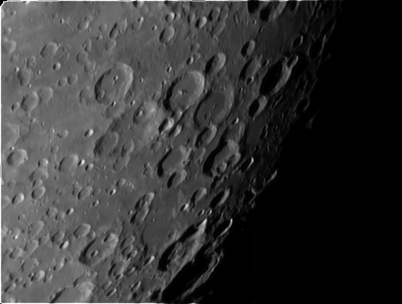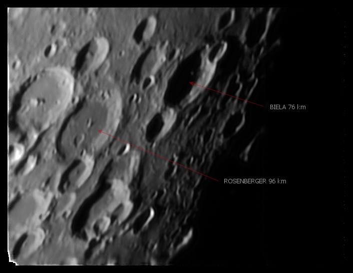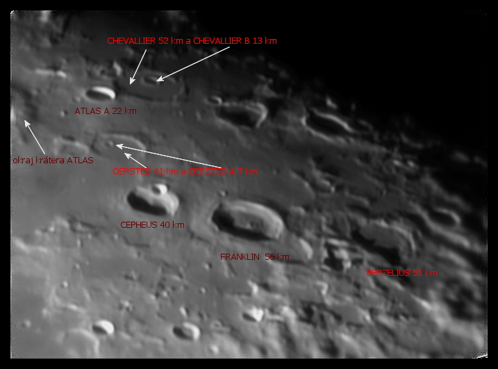 Tri fotografie Mesiaca zobrazujú rôzne typy mesačného povrchu a mesačných kráterov. Krátery Chevallier a Franklin majú približne rovnaký priemer, ale dno Chevallieru je rovné, zaliate lávou, dno Franklina je členité so zachovanou prvotnou štruktúrou krátera so stredovým pahorkom. Kráter Oersted má dno zaliate lávou a čiastočne zarovnaný aj okrajový val. Porovnajte počet kráterov na jednotkovú plochu (hustotu kráterov) v okolí krátera Rosenberger a oblasti nedzi krátermi Atlas a Cepheus, ktoré je zaliate lávou. Je zrejmé z počtu kráterov, že zaliate oblasti sú mladšie ako husto ktáterované oblasti (tzv. pohoria, alebo pevniny), lebo čím je plocha dlhšie vystavená dopadom meteoritov, tým viacej kráterov sa na nej vytvorí. Fotografované ďalekohľadom Kutter 110/2720 kamerou ASI 120 mm 5.3.2018. Autor: Peter Dolinský