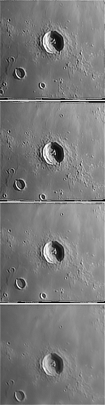 Zmena vzhľadu (pohyb tieňa najmä na stredovom pahorku) krátera Lansberg (priemer 40 km) v priebehu 3 hodín. Dalekohľad Kutter 110/2720 + ZWO ASI120MM. 25.2.2018, 18:33 UT (hore) až 21:33 UT. Autor: Peter Dolinský.