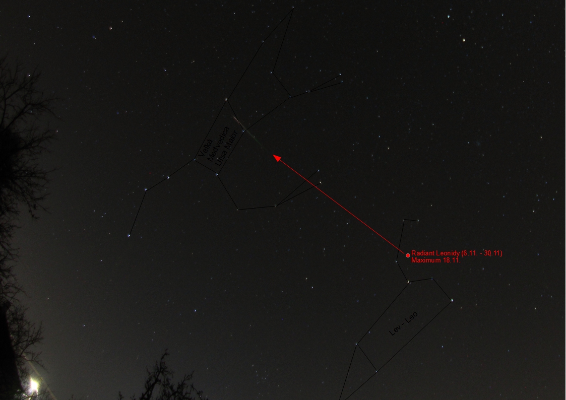 Meteor z roja Leonidy. Objektiv Samyang 8 mm, clona 3.5, ISO 800, exp. 30 s, dátum 18.11.2018, 3:07 SEČ. Autor: Aleš Nečas.
