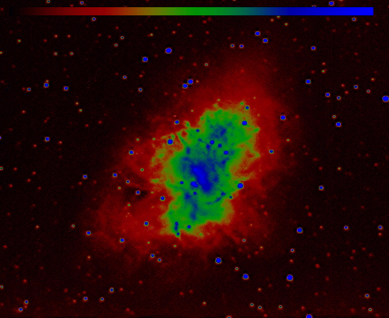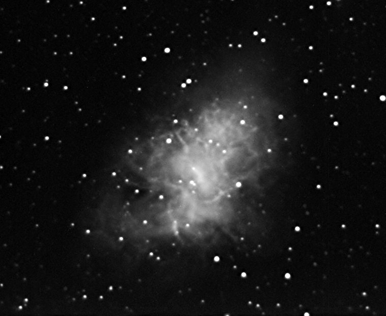 Krabia hmlovina M1 v súhvezdí Býk. Je to pozostatok po výbuchu supernovy v roku 1054. Horný obrázok je v čierno-bielom prevedení, dolný v nepravých farbách. Jasu obrazu sú priradené farby od najtmavšej po najsvetlejšou v poradí čierna-červená-zelená-modrá. Fotografované ďalekohľadom Newton 254/1000 kamerou ASI 120 mm 4.3.2018 celkovou expozíciou 35 minút. Autor: Peter Dolinský