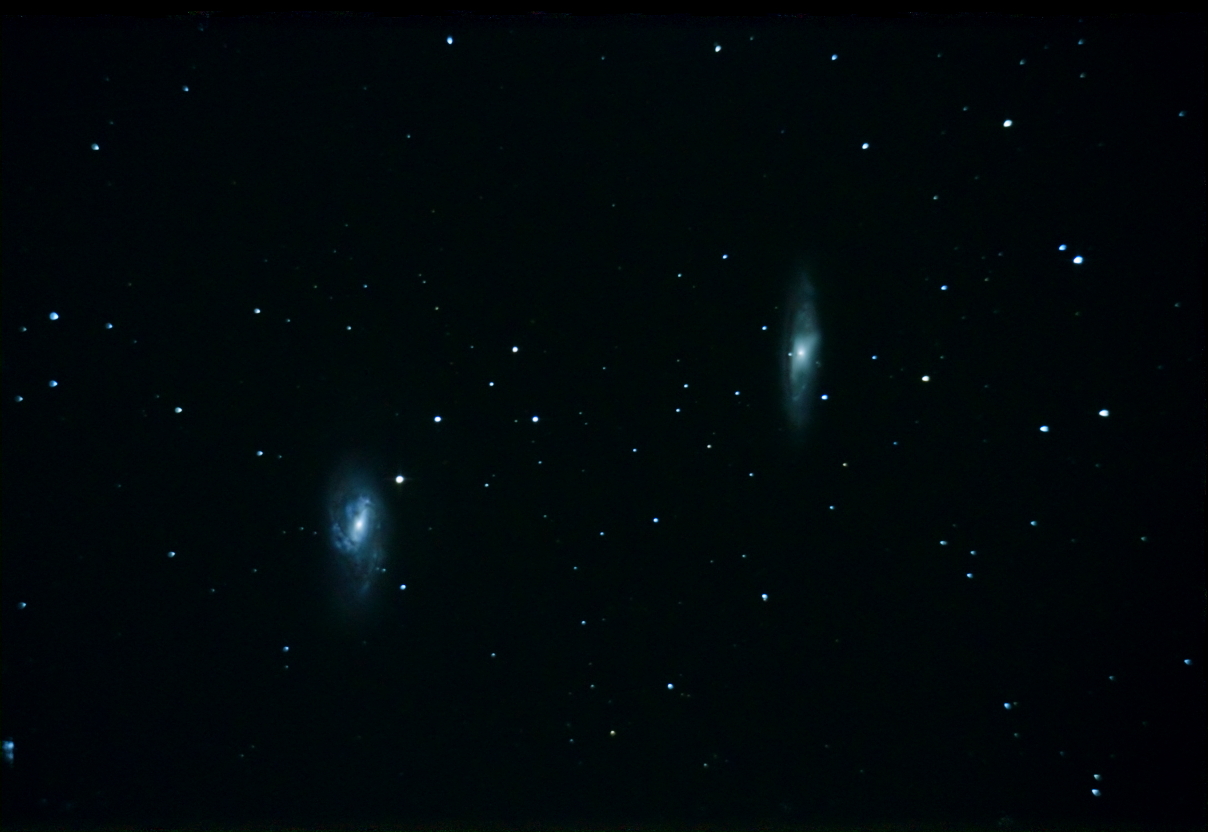 Galaxie M65(vlavo) a M66(vpravo). Newton 254/1000 + Canon 7D. Iso 3200, expozicia 675s. Autor: Peter Dolinský.