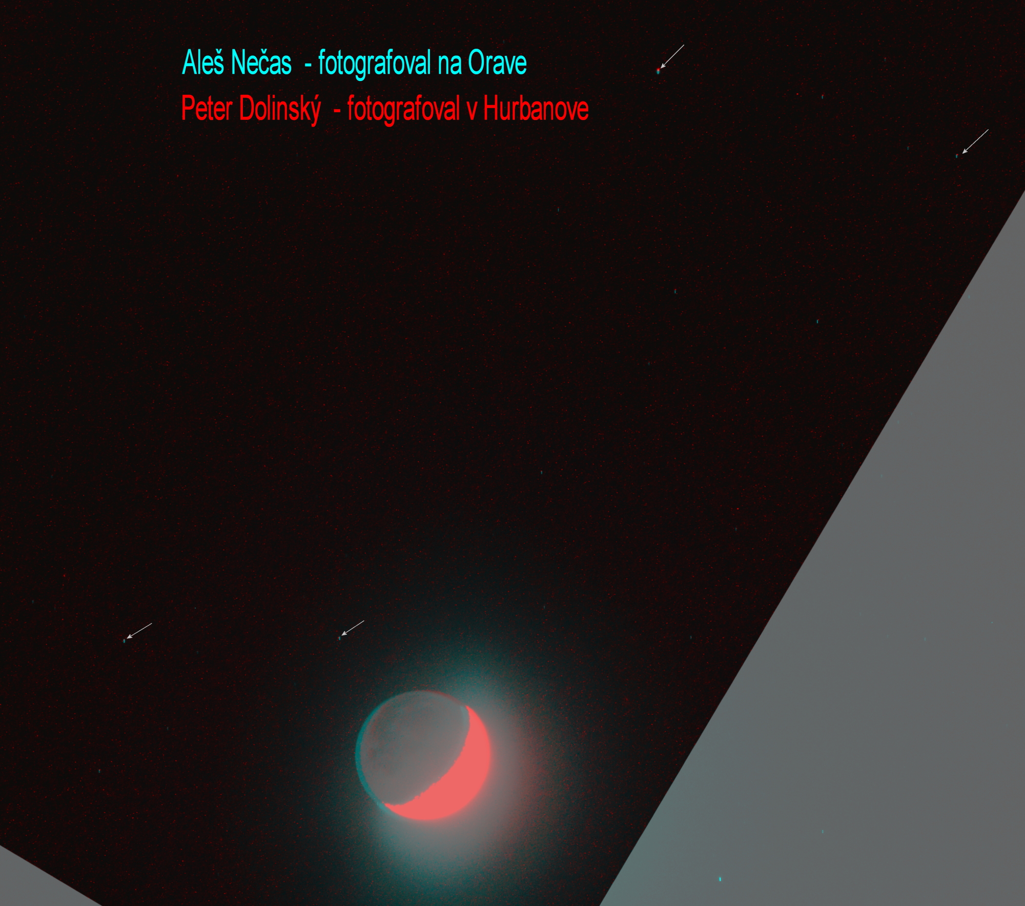 Paralaxa Mesiaca. Paralaxa je zmena polohy pozorovaného objektu pri zmene polohy pozorovateľa, teda pre dvoch pozorovateľov na Zemi sa Mesiac (v tom istom okamihu) javí mierne posunutý medzi hviezdami.(Presne povedané aj hviezdy sa posunú v závislosti na ich vzdialenosti, lenže tento posun je nesmierne malý vzhľadom na ich veľkú vzdialenosť).Fotografia je zložená z dvoch fotografii Mesiaca (s hviezdami) z 20.4.2018. Jedna fotografovaná v Oravskej Lesnej (Aleš Nečas) a druhá v Hurbanove (Peter Dolinský). Šípkami sú označené hviezdy. Keďže tie sú veľmi ďaleko, tak vplyv zmeny polohy pozorovatelov je úplne zanedbatelný a hviezdy sa prekrývajú (červené hviezdy a tyrkysové čiaročky). Rozmazanie hviezd na čiaročky je spôsobené chvením fotoaparátu počas expozície, (bodové hviezdy sú zložené so začiatkami čiarok). Mesiac je viditeľne posunuý medzi hviezdami (v kolmom smere ako je rozmazanie hviezd), čo je spôsobené jeho pomerne malou vzdialenosťou od Zeme (vtedy bola jeho vzdialenosť asi 366 000 km). Fotografie sú v nepravých farbách, aby sa dali ľahšie rozlíšiť. Autori: Aleš Nečas a Peter Dolinský.