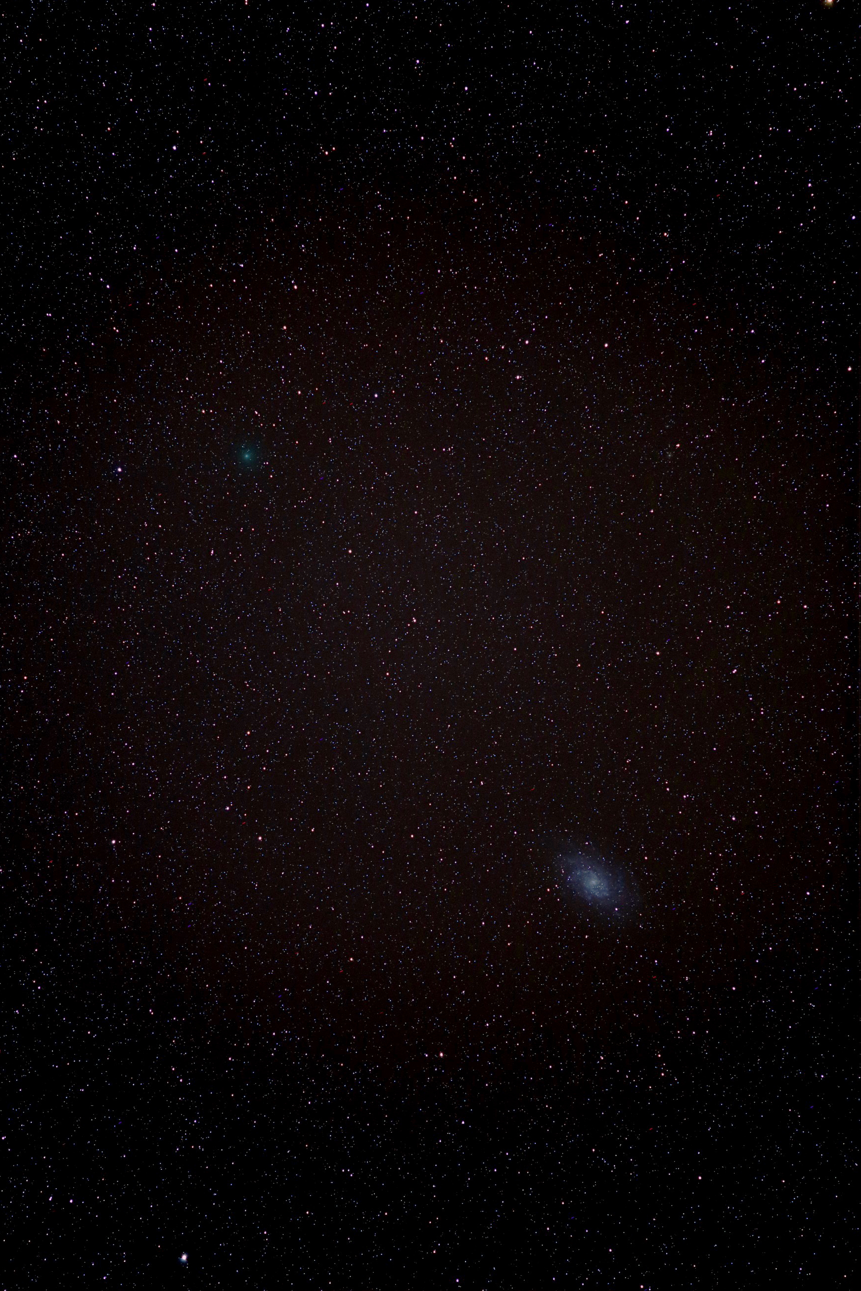 Kométa 64P Swift-Gehrels (hore) a galaxia M33 (dole). Canon 6D + Canon 2.8/200, 5x 30s, ISO 4000. 28.11.2018. Autor: Peter Dolinský.