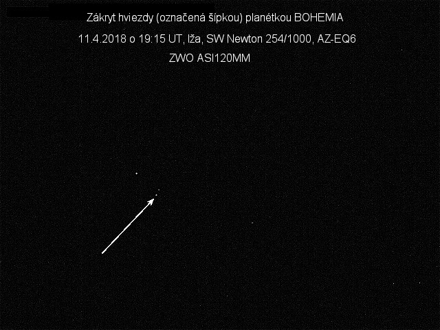 Zákryt hviezdy asteroidom Bohemia 11.4.2018 o 19.16 UT. Na hornom obrázku je svetelná krivka zákrytu. Obrázok pod ním ukazuje zakrývanú hviezdu. Po kliknutí naň sa spustí krátka videosekvencia (ak nie, stiahnite si ju do počítača). Spodný obrázok ukazuje prerušenú stopu zakrývanej hviezdy. Autor: Peter Dolinský.