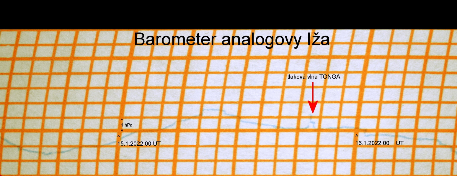 Fotografia zobrazuje výsek záznamu analógového barometra na ktorom je vidno tlakovú vlnu, ktorá vznikla výbuchom podmorskej sopky Tonga. Čas kým sa vlna dostala k nám bol asi 14 hodín. Vzdialenosť sopky od SR je asi 13 000 km. Autor: Peter Dolinský.
