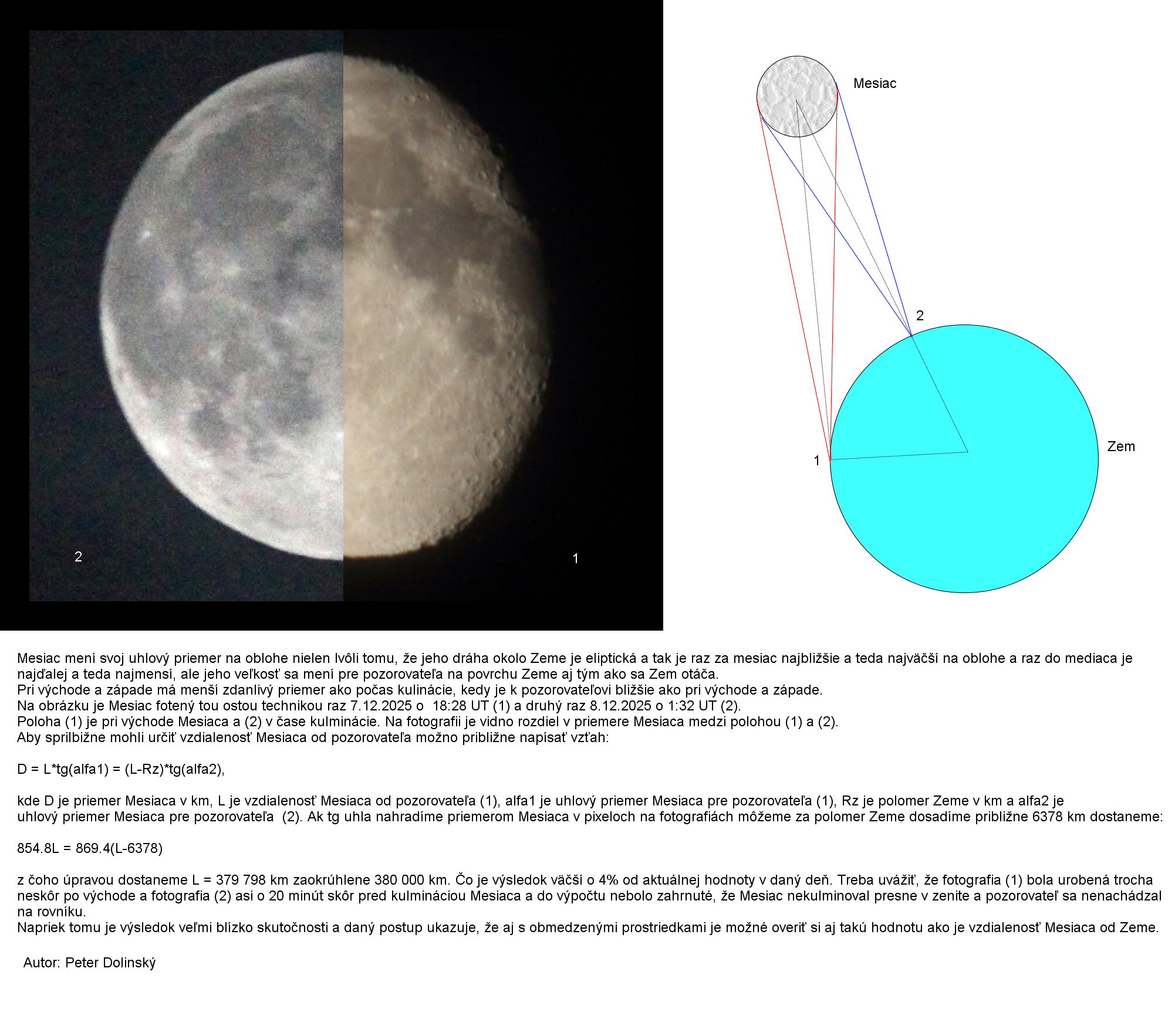 Fotografia, náčrt a text ukazujúci určenie vzdialenosti Mesiaca pomocou fotografie. 7/8.12.2025. Autor: Peter Dolinský